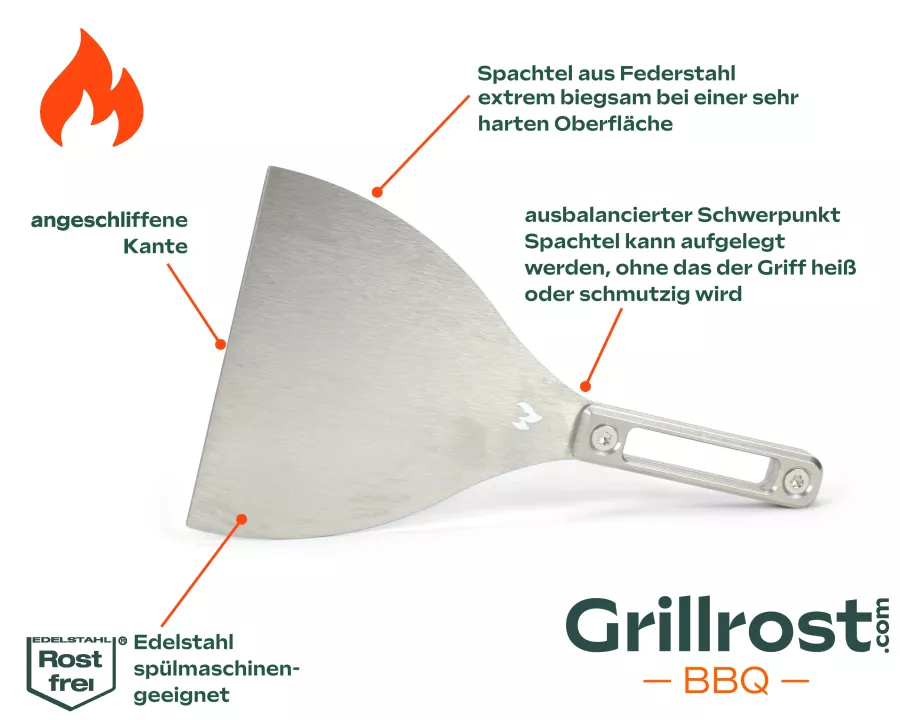 Diese Universalgröße passt auf viele Grills und sorgt für eine gleichmäßige Hitzeverteilung – perfekt, um Fleisch, Fisch und Gemüse schonend und gleichmäßig zu garen.Spachtel für Feuerplatte / Plancha – Die ultimative Grillspachtel: