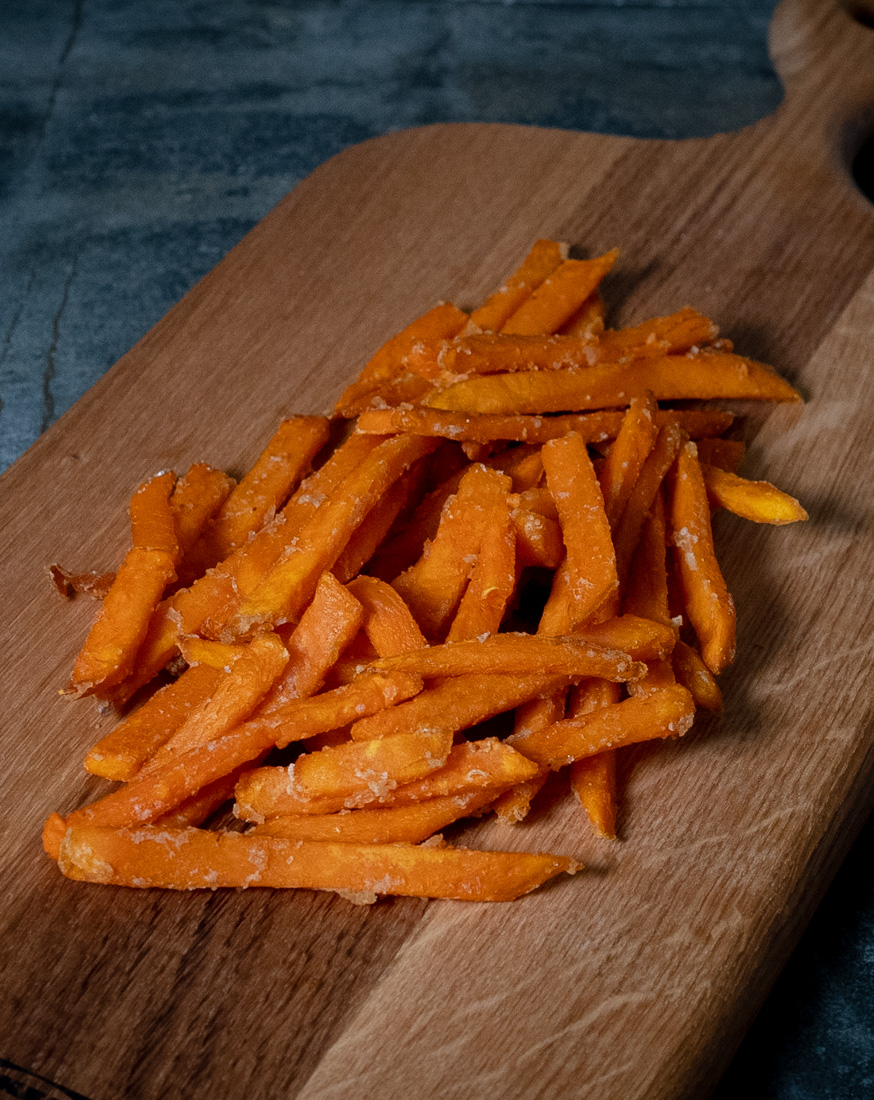 - Schneide die Süßkartoffeln in gleichmäßige Stifte und trockne sie gut ab.